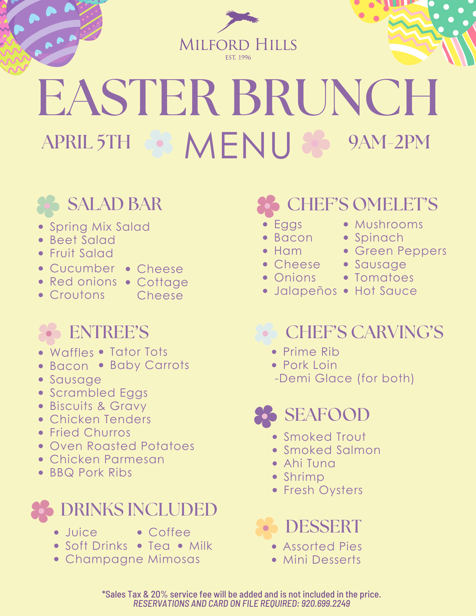 Reservations are required and a credit card is required to hold your reservation. All reservations subject to our cancellation policy. Tax and a service fee will be added and is not included in price. Call 920.699.2249 or email info@milfordhills.com today!