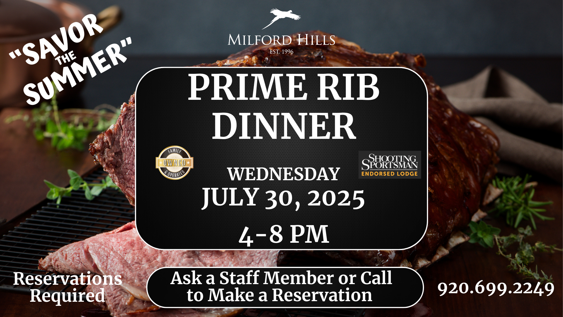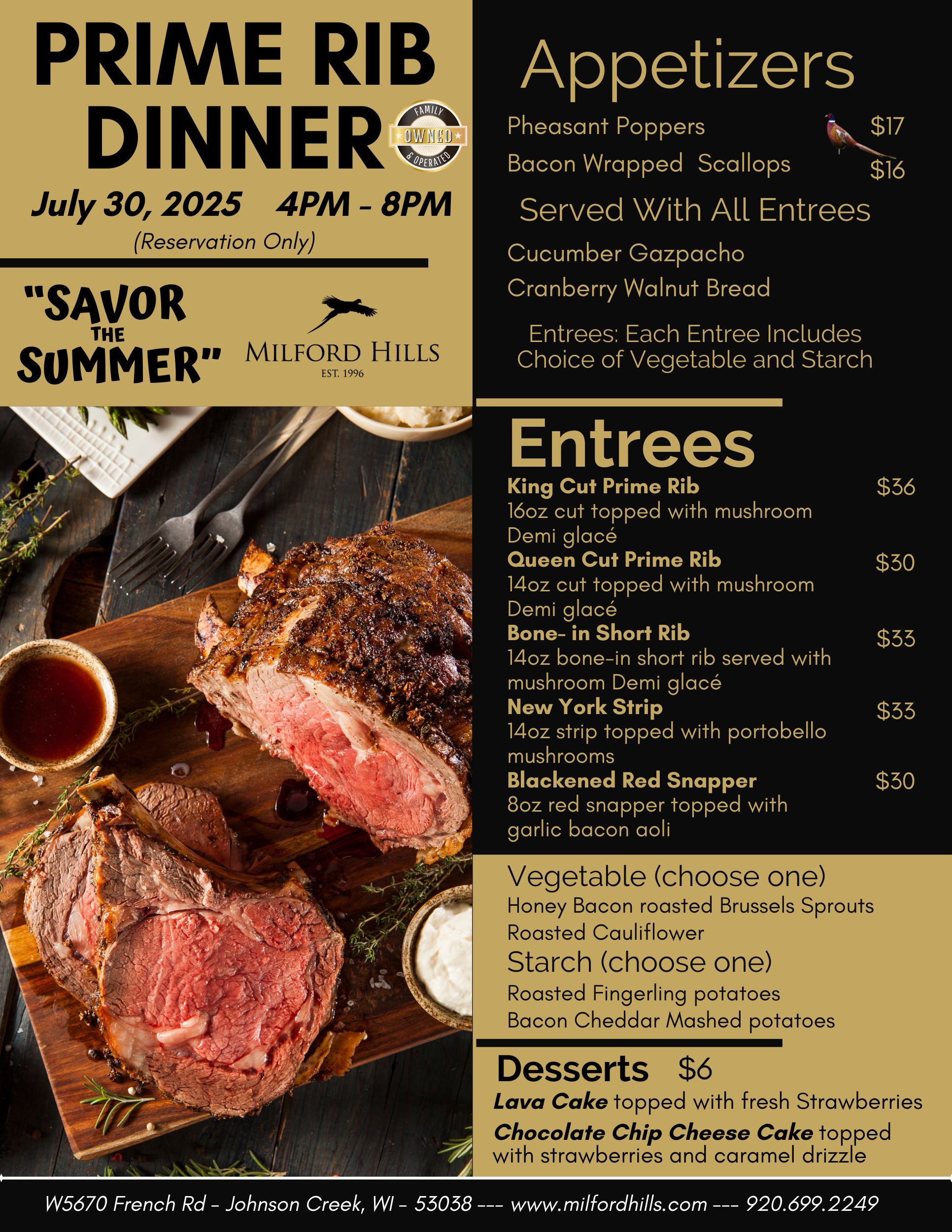 All Special Dining Events do not include tax or gratuity/service fee. A service gratuity of 20% will be automatically added and is not included in price. To make reservations AFTER JUNE 1, please call 920.699.2249 or email heidi@milfordhills.com